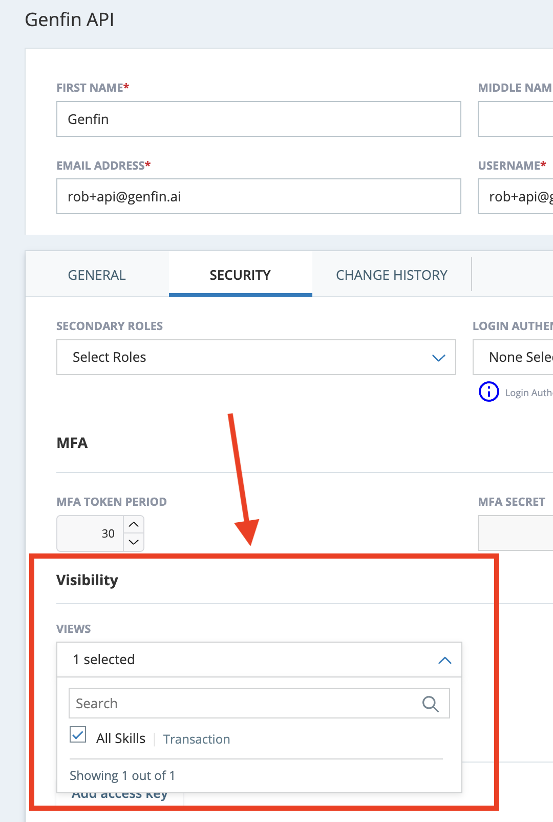 - In the user’s Security tab, ensure the API user can see the Views tied to the Skills you’ll integrate.