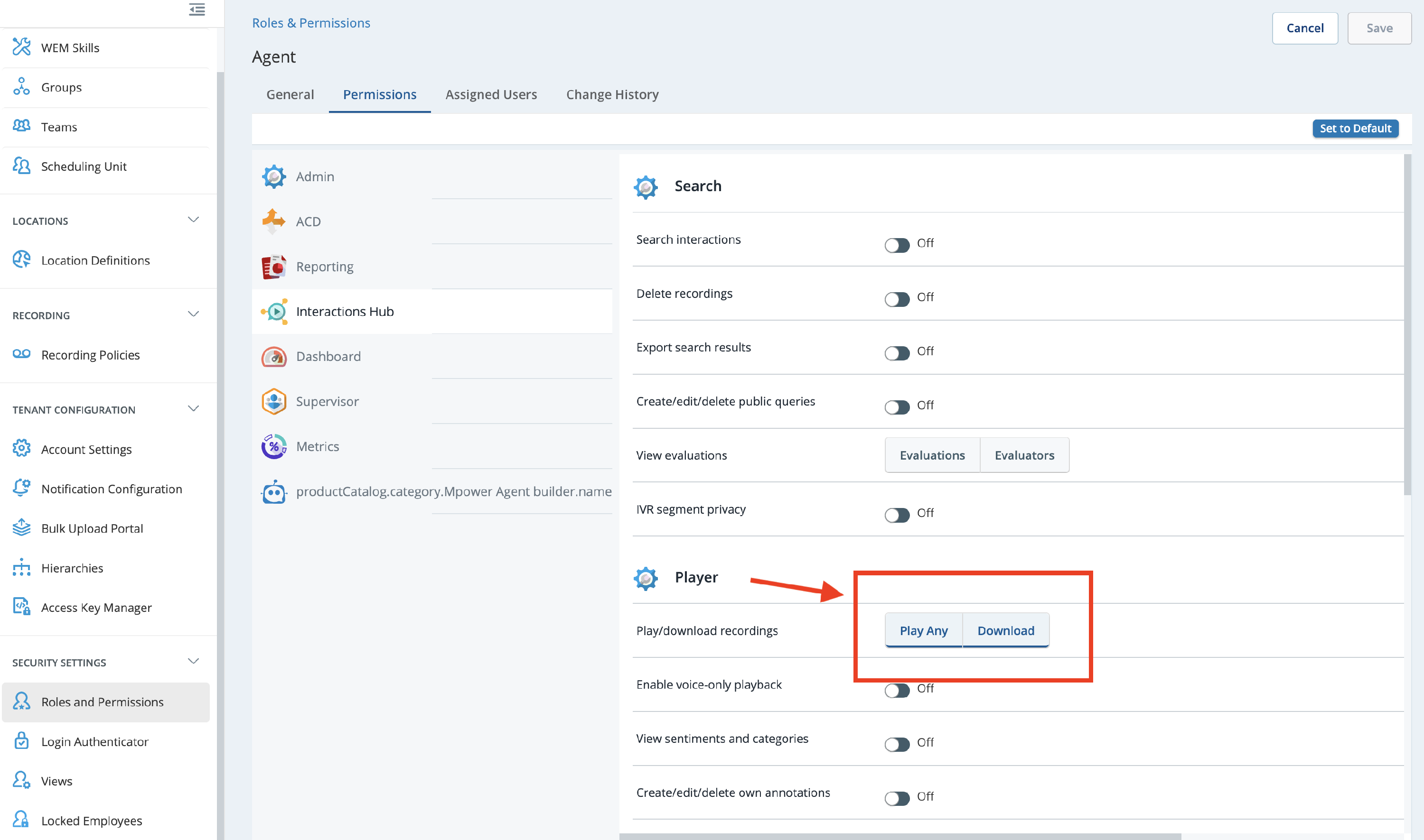 - Assign a Role that grants Interactions Hub → Player → Play Any and Download.