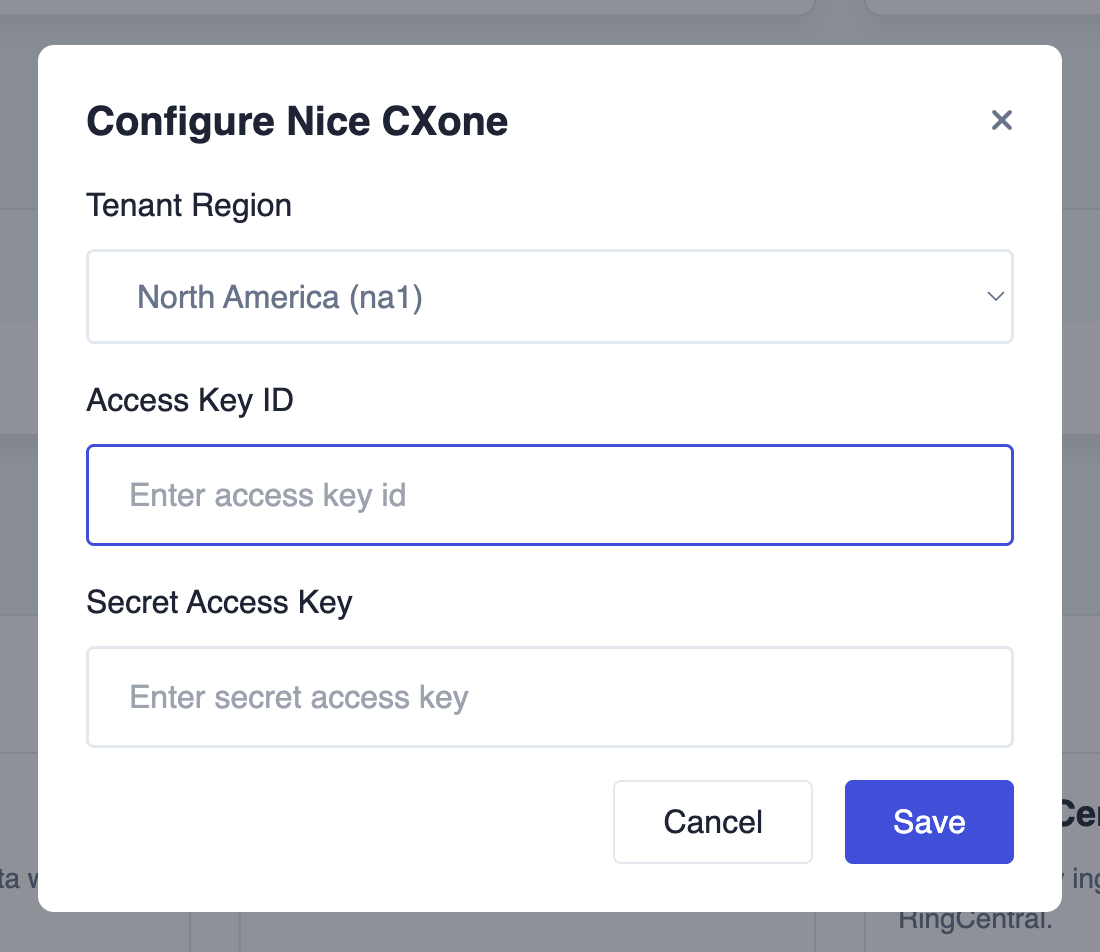 Enter your Tenant Region, Access Key, and Secret Access Key from the NICE API user, then Save.