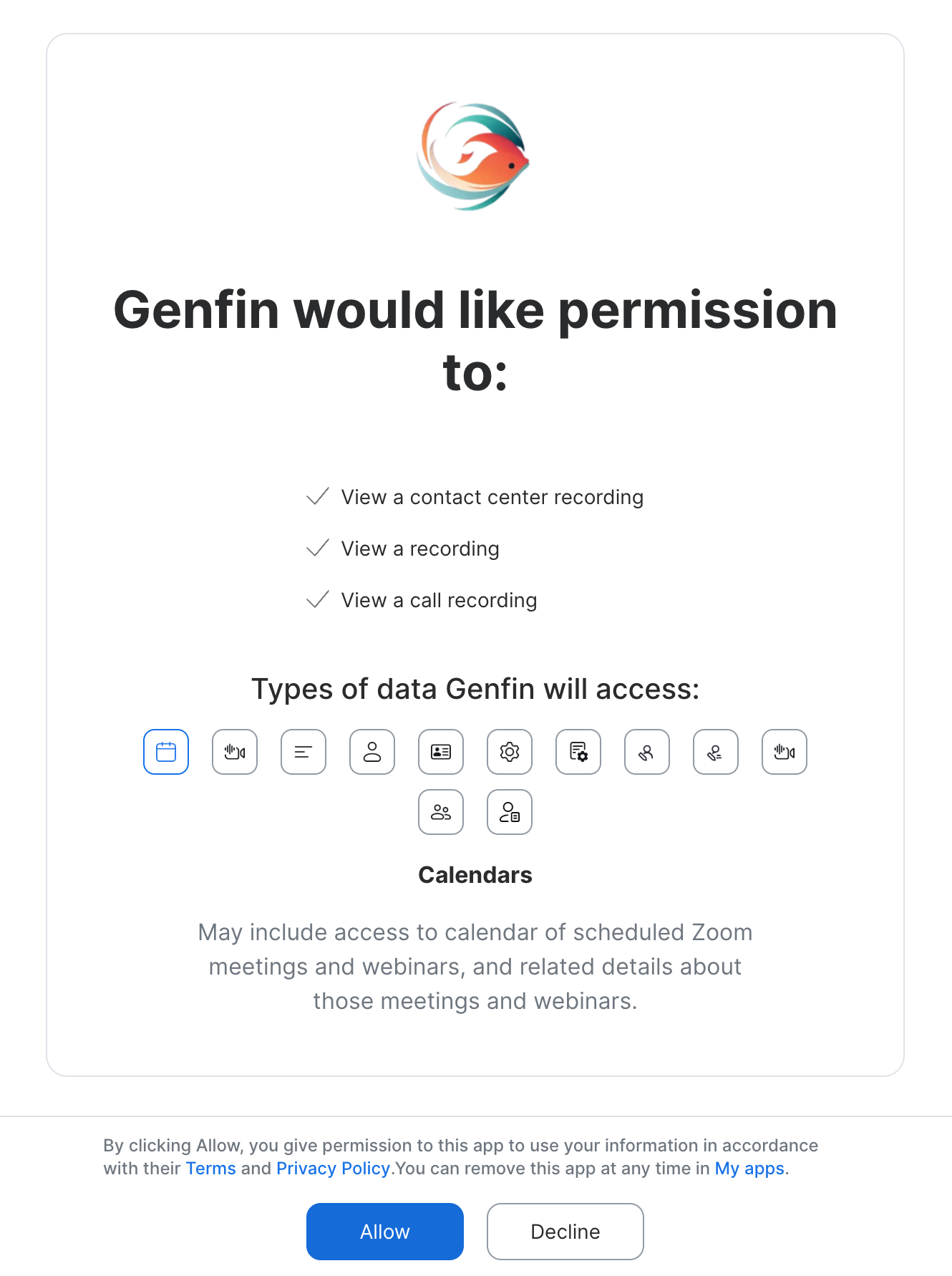 Zoom will verify that you want to connect your account to Genfin. Click "Allow".