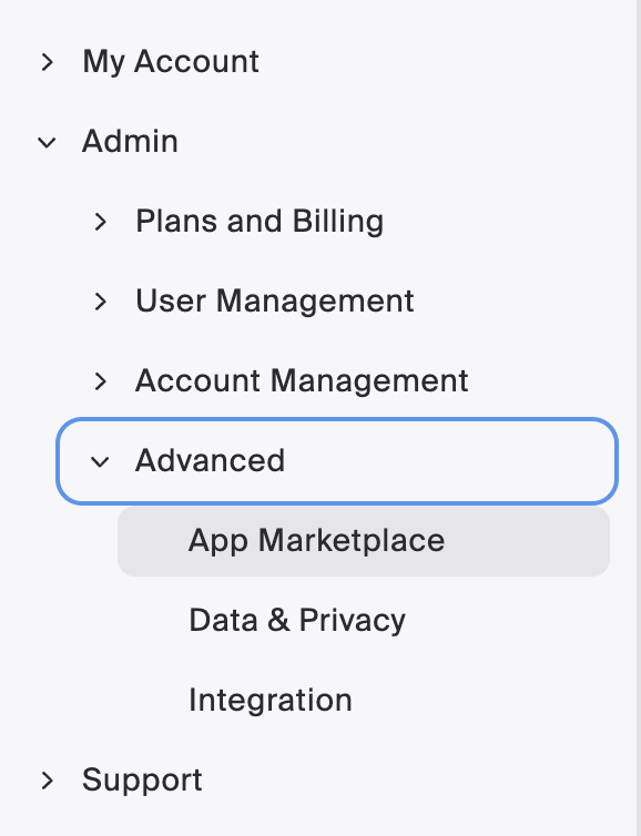 In the sidebar, navigate to "Admin" > "Advanced" > "App Marketplace".