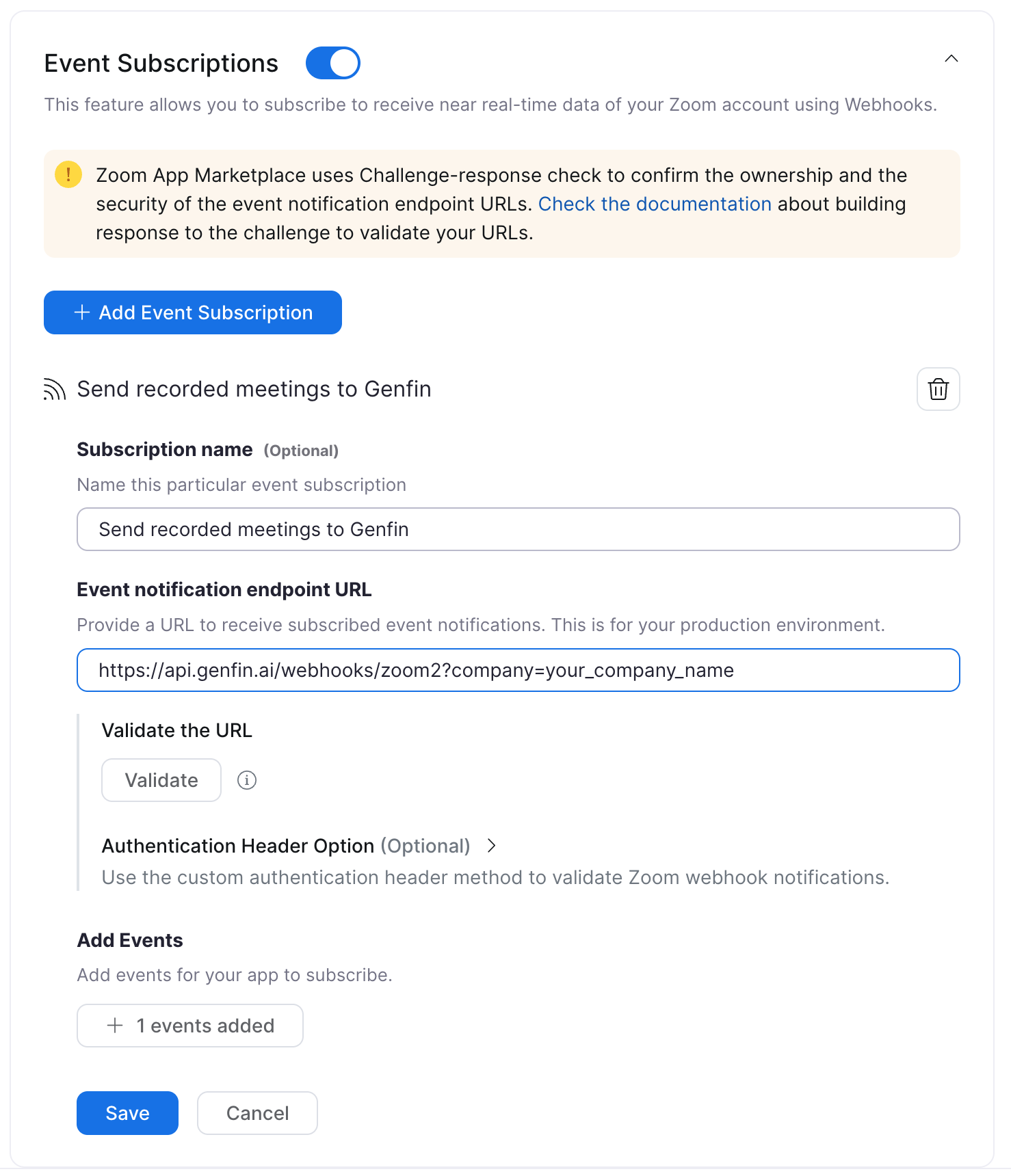 - Type in "Send recorded meetings to Genfin" for the Subscription Name.