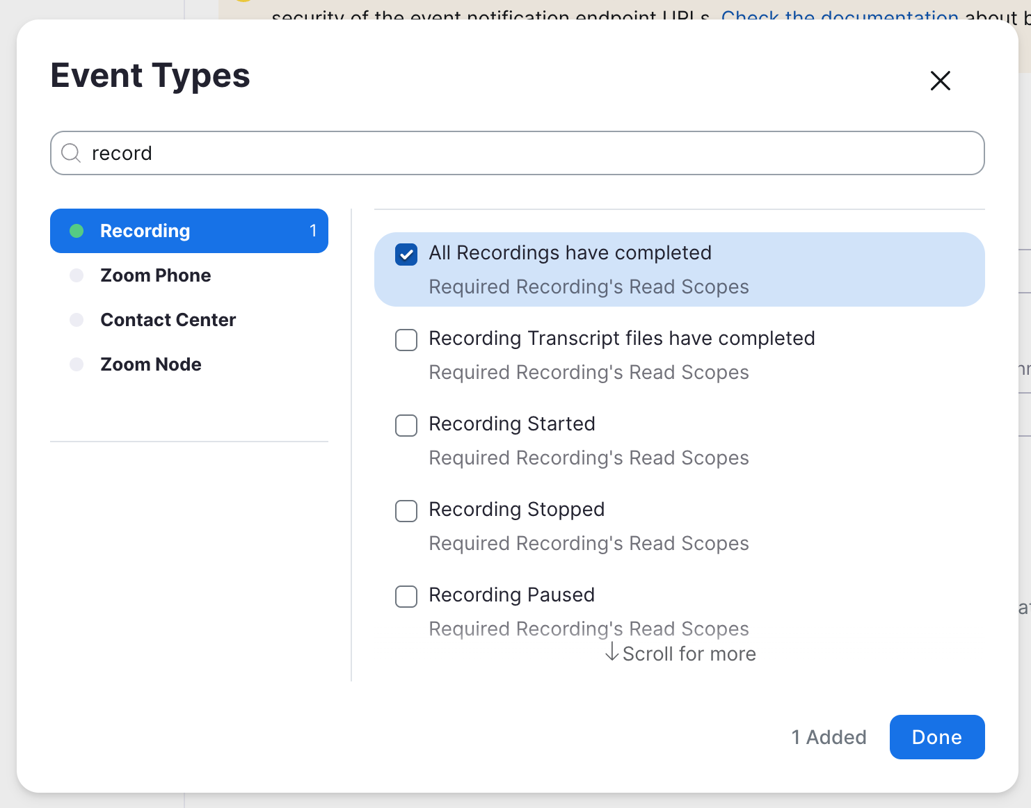 Under "Add Events", click "Add Events" and select "Recording" > "All Recordings have completed".