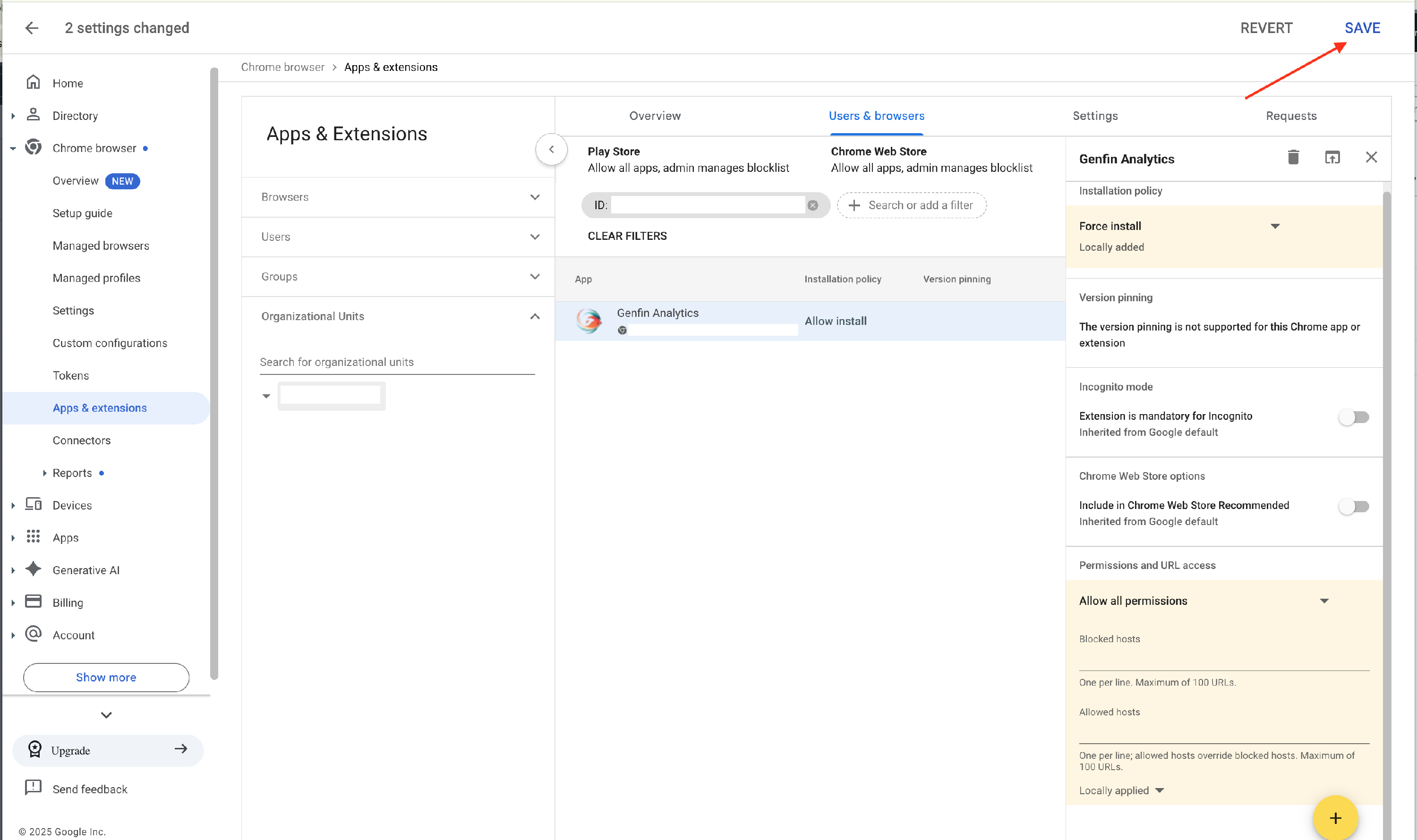 - Type in the Chrome Extension ID from your Genfin's Organization page.